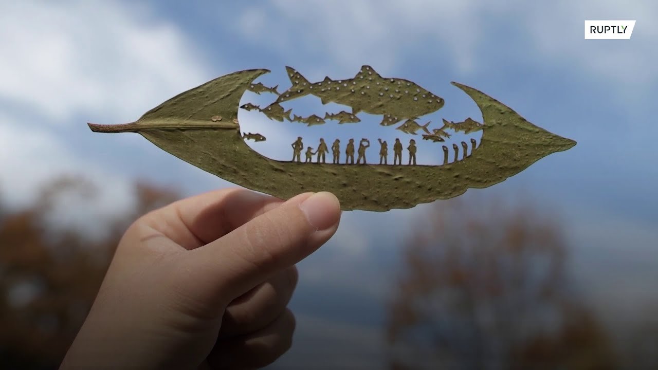 위영상을참조해다음을해석하시오. Looking for a lockdown-suitable hobby? Japanese artist Kenji Hashimoto creates art by assiduously hand carving intricate scenes into leaves. However working with leaves can be tricky. Hashimoto says he wants people to think ‘what will happen next?’ when looking at his art.